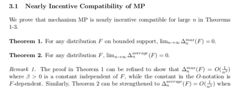 姚期智首先指出,尽管 MP 不是严格的激励相容,但 Ron Lavi 等人研究了这个机制在独立同分布(Independent and identically distributed, IID)的情况下能够多接近激励相容。而他们基于广泛模拟和一些分析工作,猜测这一机制是接近激励相容的。