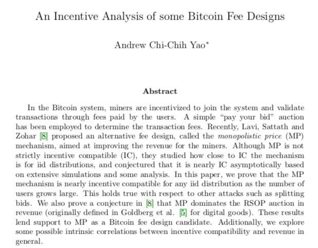 著名计算机学家、图灵奖唯一华人得主姚期智也注意到了这个问题。他的最新发表论文《比特币费率设计的激励分析》(An Incentive Analysis of some Bitcoin Fee Designs),就以比特币交易费机制为主题,从数学的角度为近期学界提出的创新机制,提供了支持与佐证。