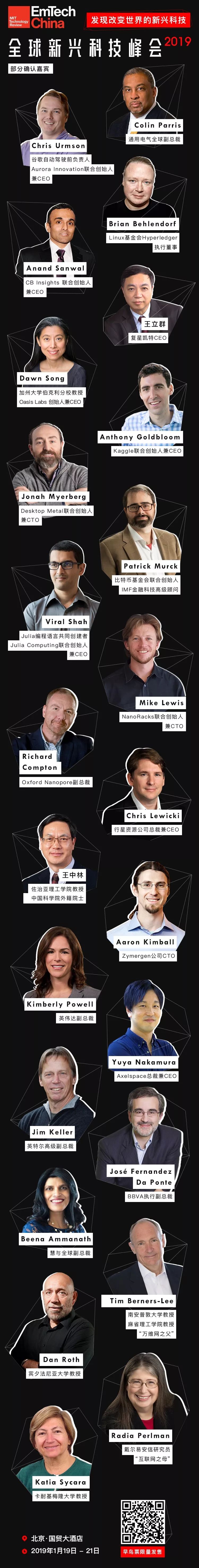2019 年 1 月 19 - 21 日,EmTech China 全球新兴科技峰会,超过 30 位全球科技“掌舵人”将亲临北京,为你展开前沿技术的壮丽蓝图,为你解读技术背后的未来价值!
