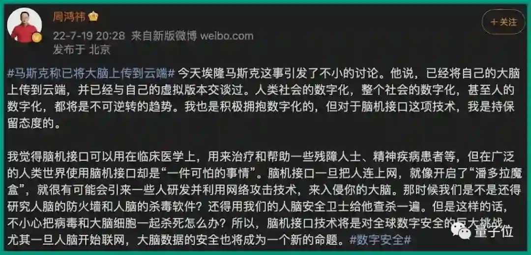 他在网上的一句“Already did it”,确认了已将大脑上传到云端同时,也把脑机接口一下子轰上热搜。