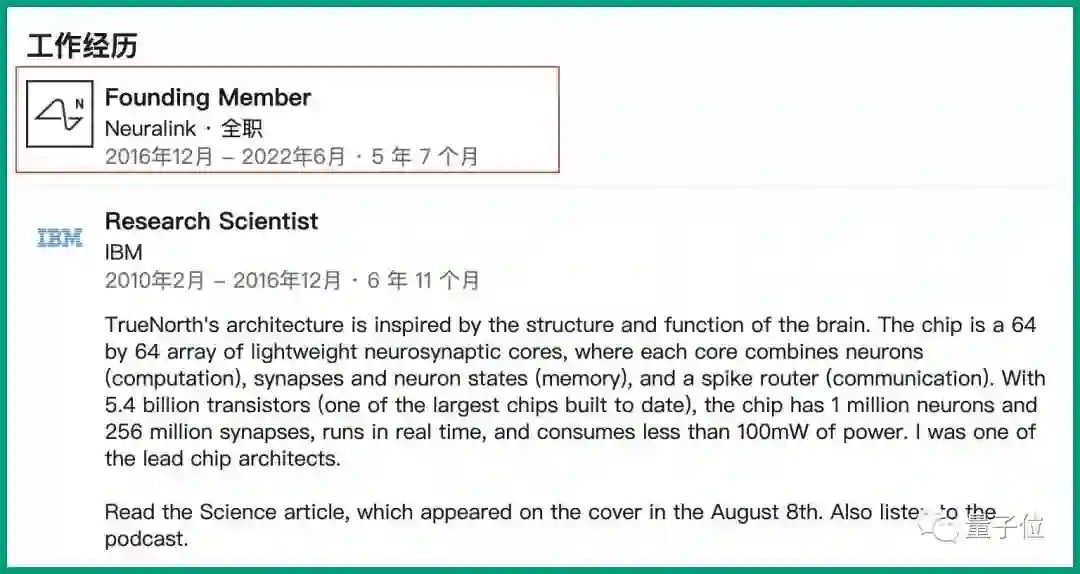 而最新被爆出来离职的联合创始人,叫保尔·梅罗拉 (Paul Merolla),强项是脑机最核心的关键——类脑芯片。