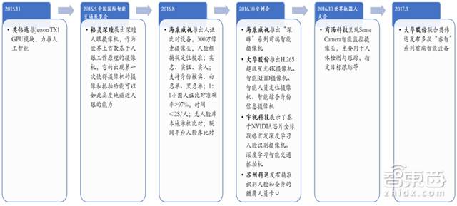 2015 年底,NVIDIA 发布了 Jetson TX 芯片,主要针对终端市场,随后,海康、大华、宇视科技、苏州科达、格灵深瞳、商汤科技等大部分公司的前端智能产品在 2016 年正式推出。