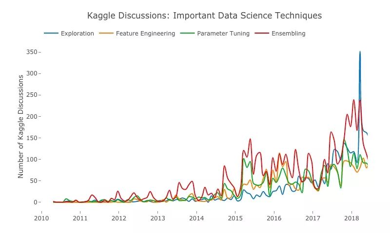 既然Kaggle是个数据科学竞赛平台,用户们讨论的内容自然是参加什么竞赛,用了什么数据集,并分享看到的实用代码。而根据上图的曲线,自从2016年推出后,代码Kernel的受欢迎度一路飙升,毕竟用户们可以在上面看到其他参赛者自愿公开的模型代码,这对于学习和交流来说是不可多得的优质资源。