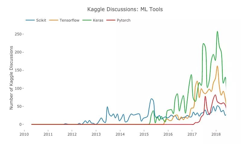 从2014年起,我们相继迎来了theano、tensorflow、keras,与此同时,一个名为深度学习的时代也渐渐出现在世人视野里。在Kaggle上,用户发表的有关深度学习的帖子数不断上升,并最终超过神经网络。此外,诸如亚马逊、谷歌等的云服务提供商也正拥抱新技术,以更加积极的姿态展示在云上训练深层神经网络的能力。