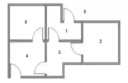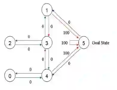 现有一个5房间的房子,如图1所示,房间与房间之间通过门连接,编号0到4,5号是房子外边,即我们的终点。我们将agent随机放在任一房间内,每打开一个房门返回一个reward。图2为房间之间的抽象关系图,箭头表示agent可以从该房间转移到与之相连的房间,箭头上的数字代表reward值。