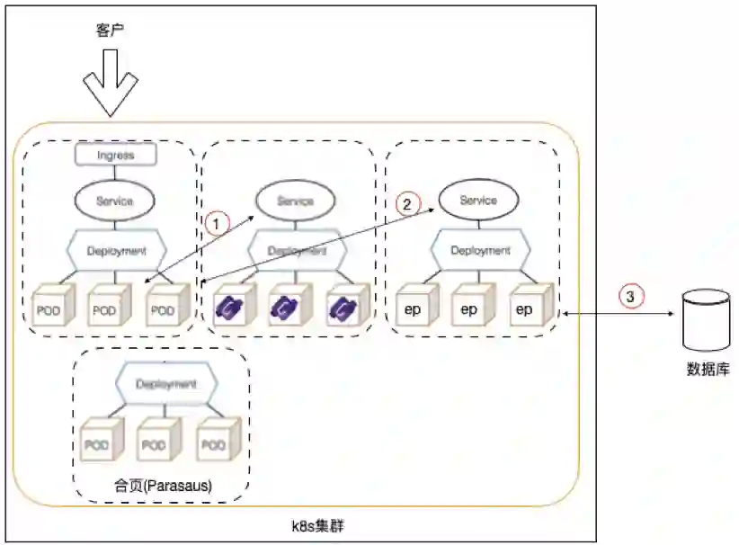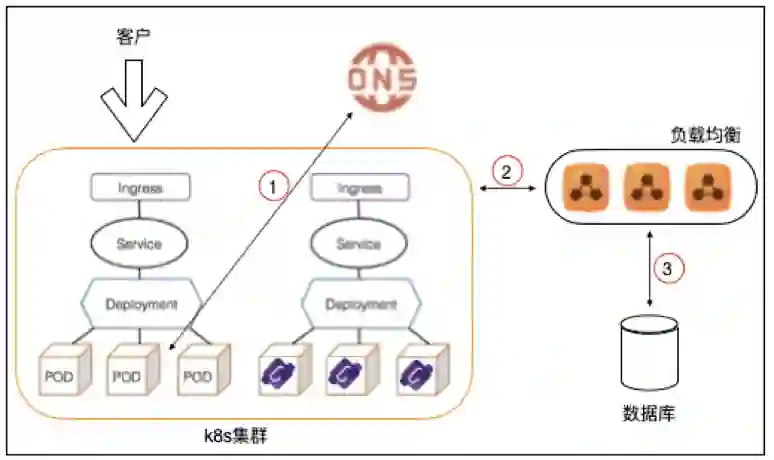 场景 1:完全云原生,是 Cloud-Native,更是 Kubernetes-Native 的,可大幅缩短通讯链路,有效降低延迟。举例:在传统场景中,K8S 中 pod 应用对外部服务的访问必须流出容器集群虚拟网络而进入数据中心物理网络,每次进出其他子网和经过转发节点(例如 DNS、负载均衡等),都会耗费时间,且增加故障域,如下: