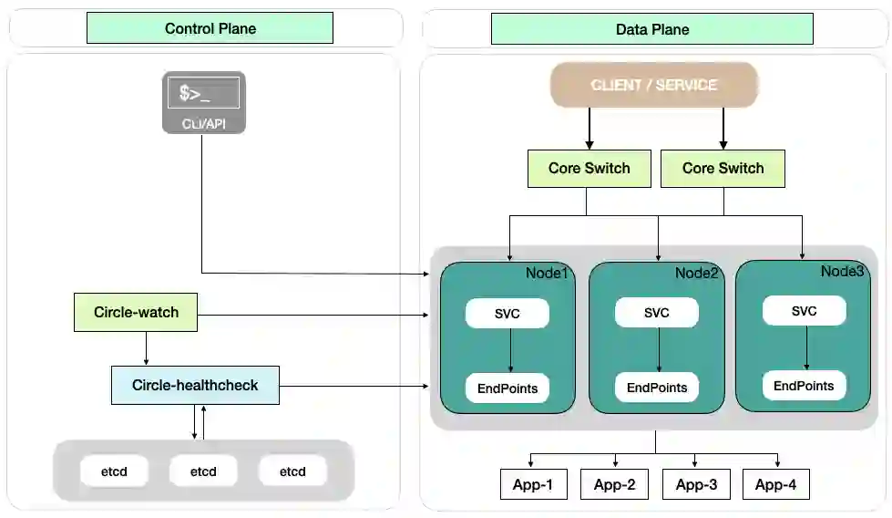 控制面比较轻量,功能简洁,circle-watch 模块观察到条目变化,触发一个 hook,在 circle-healthcheck 添加探活条目,用以及时监测到服务是否可用。circle-healthcheck 探测到有不可用服务条目或服务恢复条目时,触发一个 hook,在数据面对转发流量进行调整,使流量能全部转发到所有服务健康节点上。