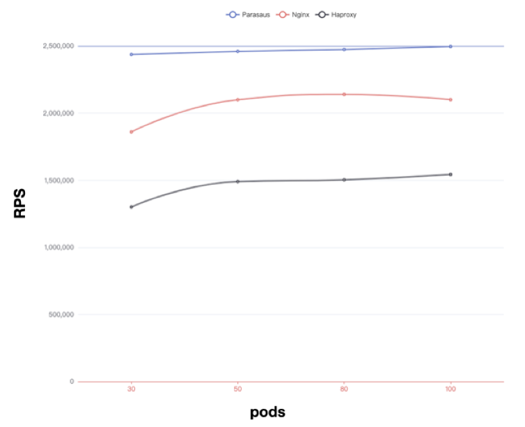 我们针对当前比较主流的负载均衡开源产品进行了比较和测试,相较于 Nginx、Haproxy,合页 (Parasaus) 性能表现更好。