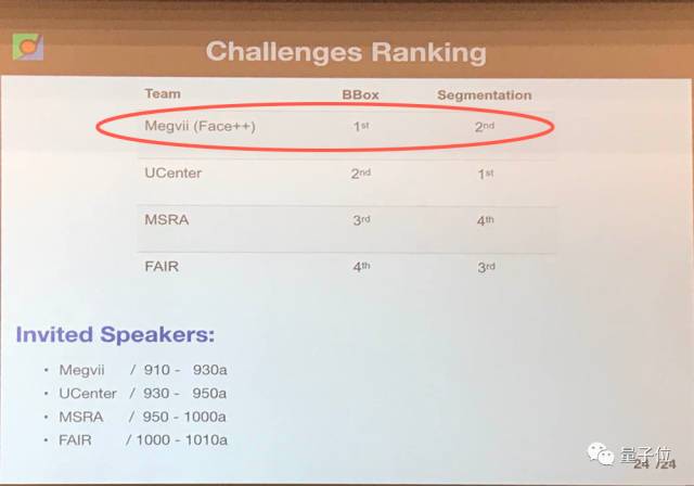 而在MS COCO物体分割检测中,由北京大学和香港中文大学联合组成的UCenter队(也可以理解为商汤科技队)夺得冠军,旷视科技(Face++)团队获得了第二名。