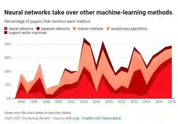 图 提及每种方法的论文百分比,神经网络显然取代了其他机器学习方法(来源:麻省理工科技评论)