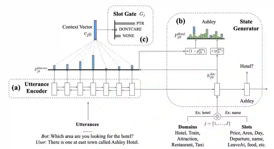 在著名的多领域对话 MultiWOZ 数据集上,来自港科大的 Pascale Fung 教授团队利用了拷贝网络,显著提高了不可枚举槽的识别精度 [20]。他们提出的 TRADE 模型如图 6 所示,每次检测槽值时,模型会将领域和槽位的不同结合进行语义编码作为 RNN 解码器的初始位置输入,解码器通过拷贝网络,直接将对应的槽值生成出来。