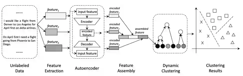 该方法是基于一个假设:相同意图的表达可能会共享相似的背景特征。模型提取的初始特征包括词向量、POS 标注、名词词簇和 LDA 四种特征。各个特征经由自编码器转成相同维度的向量后进行拼接,再采用 RBF(radial bias function)函数计算类间距离进行动态的层次聚类。距离最近的类将会自动合并,直到类间距离大于预设的阈值停止。模型框架如图 10 所示。