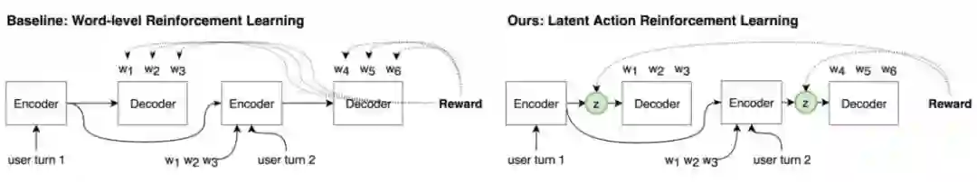 作者提出的隐动作模型和基线模型的区别是 encoder 到 decoder 之间多了离散隐变量的后验推理,对话动作由离散隐变量表示,没有任何人为的干预定义。最终实验证明,基于隐动作的端到端增强学习模型在语句生成的多样性和任务完成率上均超过了基线模型。