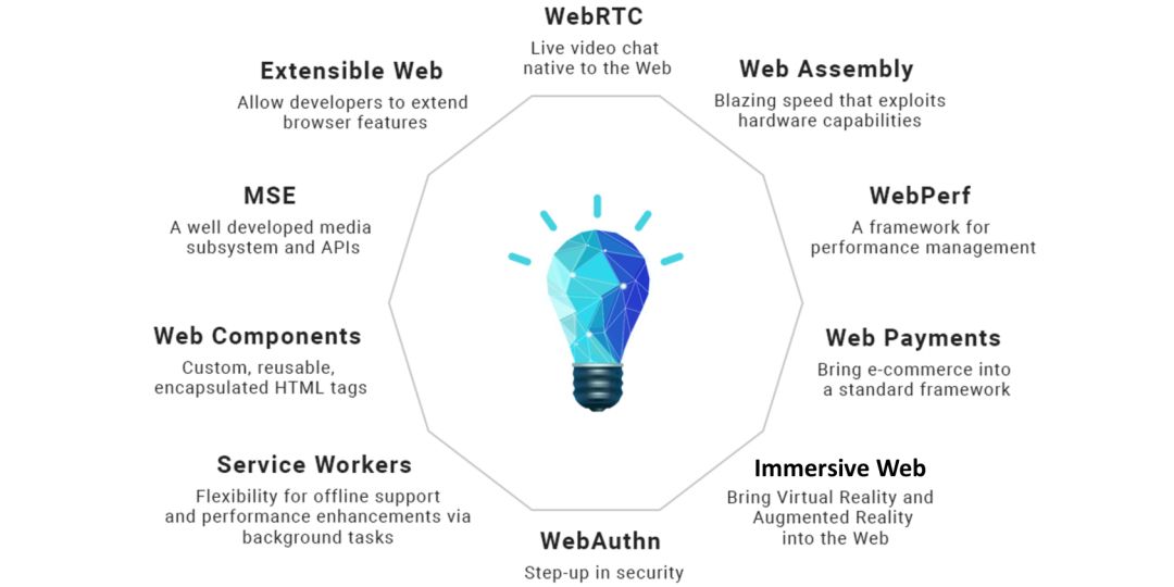 开发者可以通过 WebXR API 来创建 XR 体验。XR 包括了增强现实(AR)、虚拟现实(VR)和最近出现的沉浸式技术。前不久 W3C 刚发布 WebXR 的标准草案,我们也对其进行了介绍: