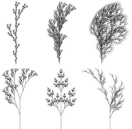 有兴趣的读者可以尝试自己调整符号集合和数学规则,可以得到许多不同的奇妙植物的图像,例如: