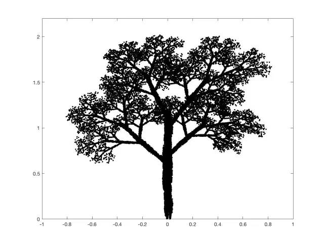 我们知道,蕨类植物是很初等的植物,器官只有根茎叶。有没有办法用迭代函数系统画出高等一些的植物呢?事实上如果我们只需要把收缩函数的个数改成六个,并适当选取参数,一颗漂亮的参天大树就跃然于屏幕上了: