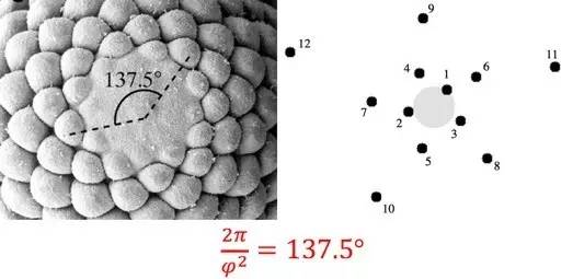 离中心最近的两颗葵瓜子之间的夹角大约呈137.5度,和黄金分割点相关
