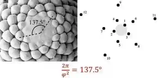 那么叶序图案是怎样产生的呢?这个问题还没有统一的答案,人们甚至还没完全弄明白向日葵螺旋叶序的产生机理。有人用能量观点(使葵瓜子之间的排斥势能最大)来解释[6],也有人用熵的极小化原理(基于诺贝尔化学奖得主,伊利亚∙普里高津提出的耗散结构理论)来解释[7],也有人通过生长素(Auxin)在植物器官中的分布状况来建模等等[8]。不过关于植物图案的生成机制,始终缺乏一种像由阿兰∙图灵提出的,简单却又本质的数学模型[9](图灵提出的模型能较为本质地解释动物图案的生成,这是两个非线性发展方程,小编在《一文带你走进全球顶尖应用数学家的世界!》中已有介绍)。