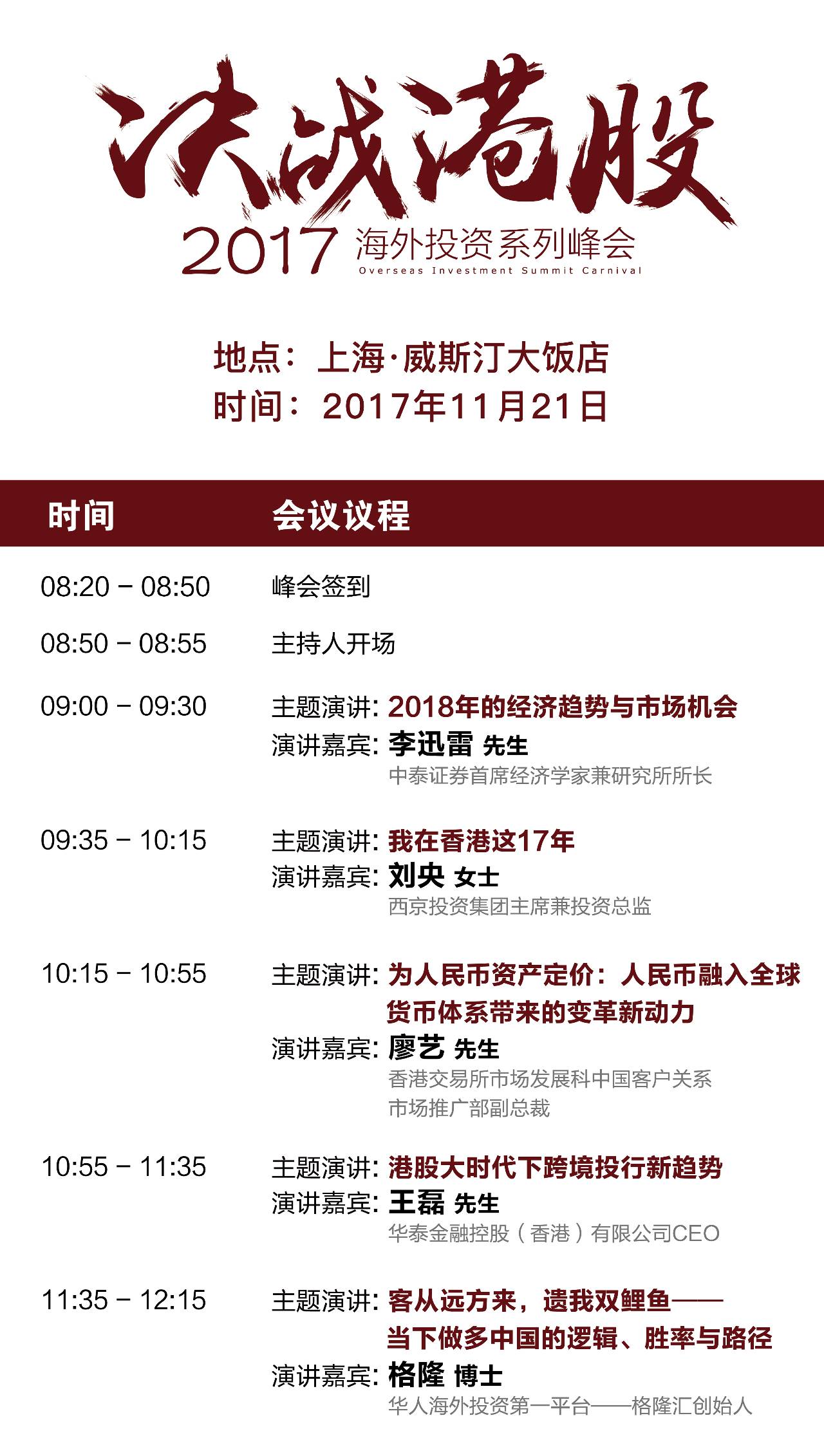 由格隆汇主办,腾讯Fintech全程独家冠名,香港交易所全程支持的“决战港股2017——海外投资系列峰会”第二站将于11月21日(周二)在上海隆重召开。