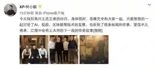 2月7日晚,小鹏汽车董事长何小鹏发布微博称,王欣身体很好,思维完全和大家一起,兴致勃勃地和大家讨论了AI、视频、区块链等技术的发展。根据何小鹏披露的照片显示,姚劲波、何小鹏、李学凌等圈中大佬为王欣接风洗尘。详见下图。