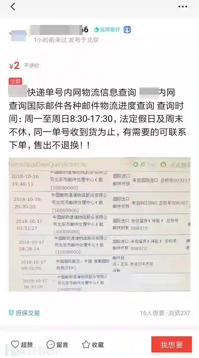 当然,这些措施并非完全杜绝了黑产行为,正如上面闲鱼提供的内部查单业务。但是均在一定程度上为黑产提高了违规成本。