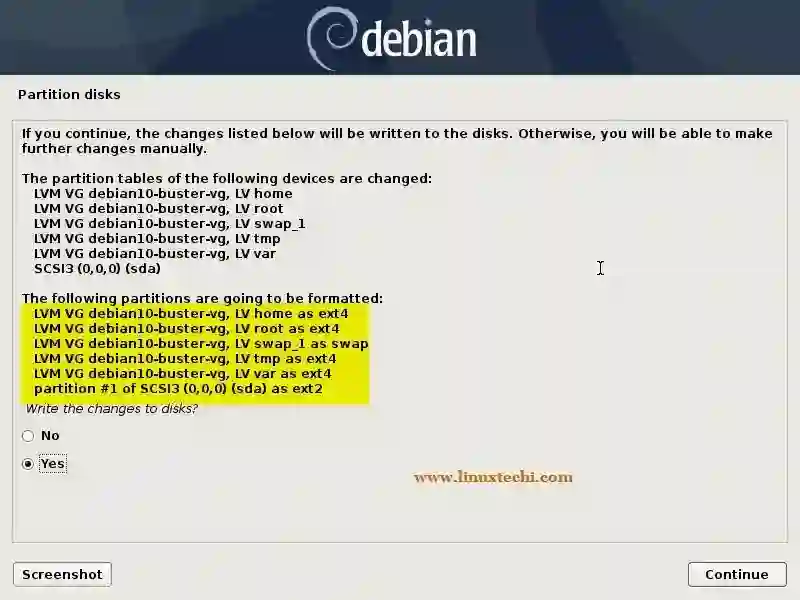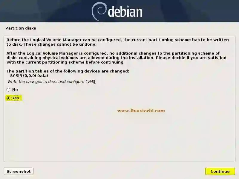 在接下来的屏幕中,选择 “yes” 来将更改写到磁盘中,配置 LVM ,然后在 “Continue” 上单击。