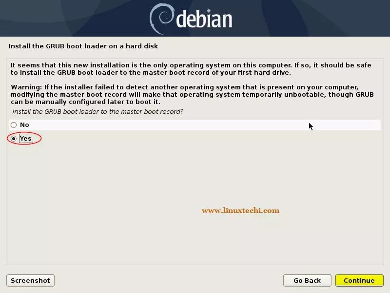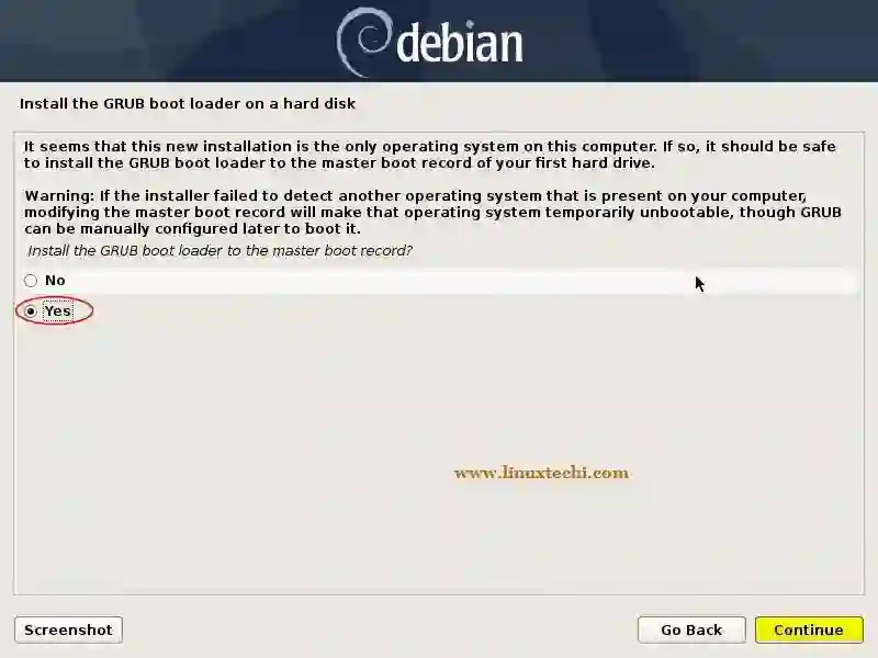 选择选项 “yes” 来安装 Grub 引导加载程序。