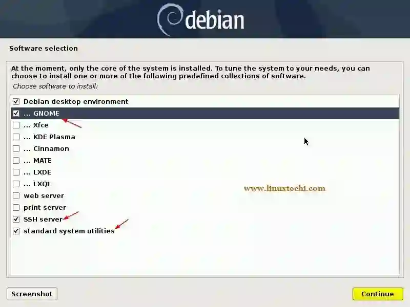 在接下来的窗口中,你将被提示选择电脑桌面环境和其它软件包,就我而言,我选择 “Gnome Desktop” ,“SSH Server” 和 “Standard System utilities”。