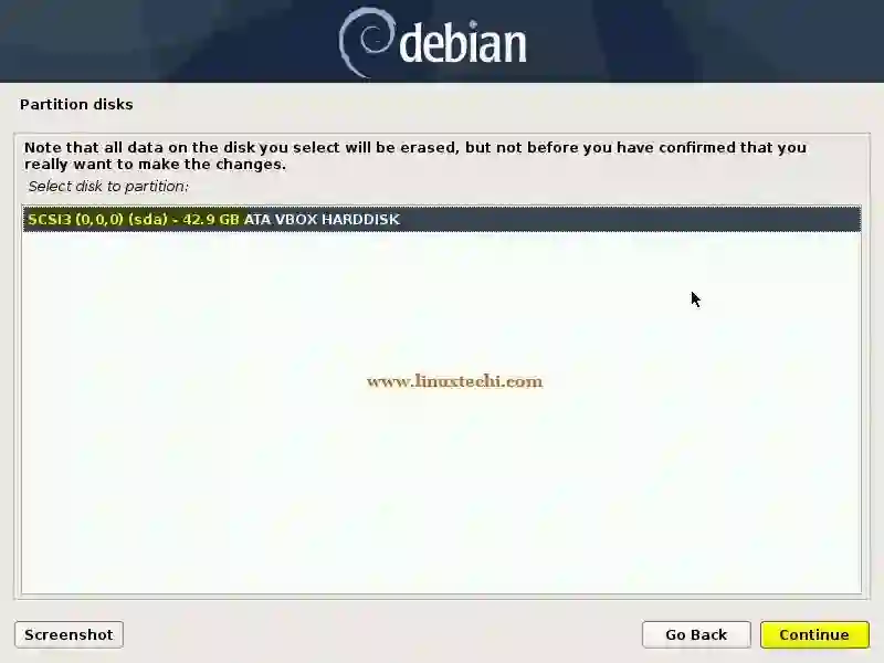 在这个步骤中,为 Debian 10 选择硬盘分区方案,就我而言,我有 40 GB 硬盘可用于操作系统安装。分区方案有两种类型: