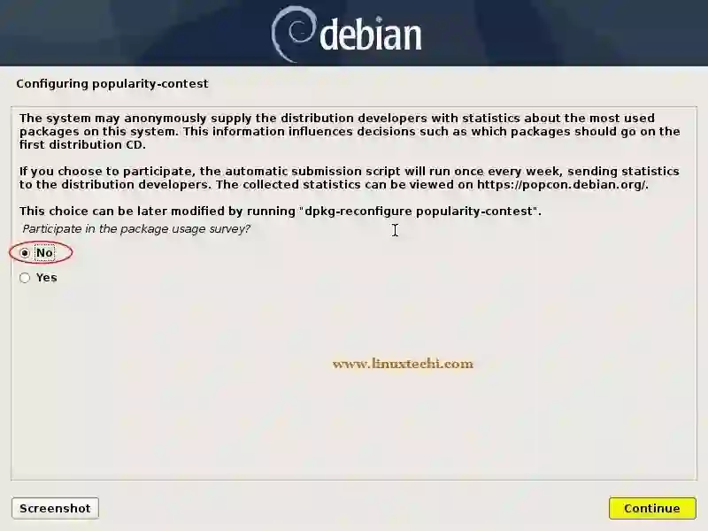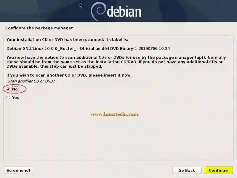 在安装期间,安装器将提示你扫描 CD/DVD 以配置软件包管理器,选择 “No” ,然后在 “Continue” 上单击。