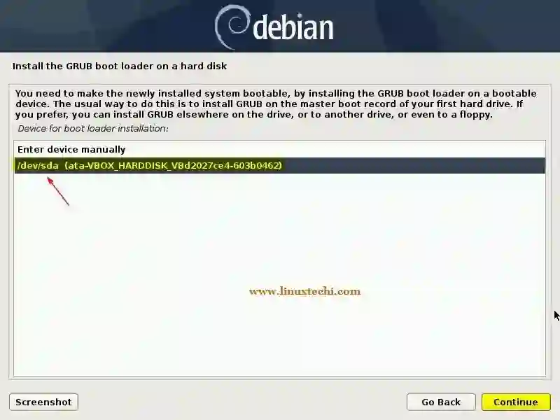 在 “Continue” 上单击来继续,然后在接下来的窗口中选择将安装引导加载程序的磁盘(/dev/sda)。