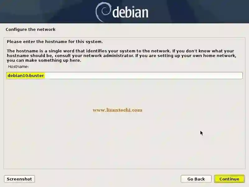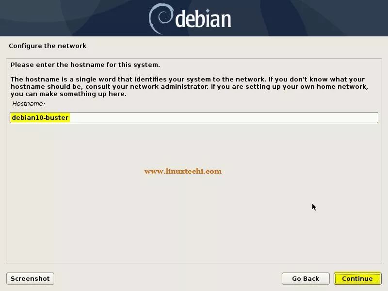 设置适合于你的环境的主机名,然后在 “Continue” 上单击,就我而言, 我指定主机名为 “debian10-buster”。