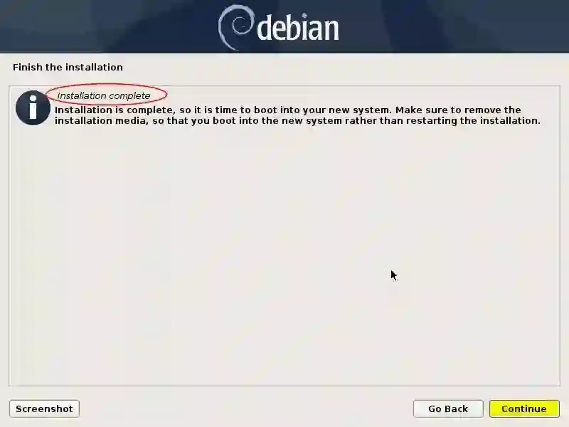 在 “Continue” 上单击来重启你的系统,不要忘记在 BIOS 设置中更改启动介质,以便系统从我们已经安装 Debian 10 操作系统的硬盘启动。