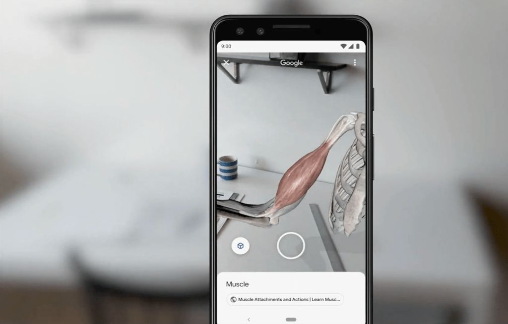 在AR如何让视觉搜索更形象方面,比如用谷歌搜索肌肉伸缩,可以直接在搜索结果中看到3D模型,并且这个模型能以AR的形式呈现在现实世界中。