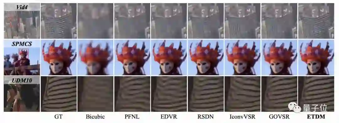 可以发现,ETDM方法超过了大部分基于时间滑动窗的多帧融合算法,如TGA、RBPN和EDVR,也超过了部分基于双向循环卷积网络的方法。值得一提的是,虽然ETDM的主干网络为单向的隐层传递,但它也超过了BasicVSR、GOVSR这类基于双向卷积网络的方法。