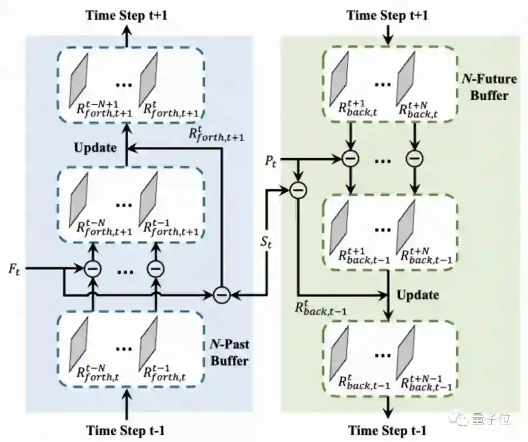 为了充分利用不同时刻下的互补信息, 我们维护了长度为 的存储器, 来存储 个过去 和末来时刻的超分辨率结果,即 和 。