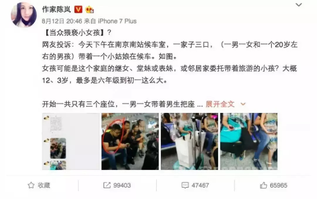据称8月12日晚上,在南京南站候车室里,一男一女和一个20岁左右的男孩,带着一个小姑娘候车。众目睽睽之下,该男人公然把未成年女孩抱坐在自己大腿上,将手伸进小女孩的裙子里摸索。