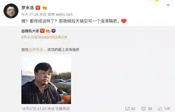 【罗永浩回应“被Sharklet科技解约”:哦?】日前,一则“罗永浩被Sharklet科技解约”的消息在网上传的沸沸扬扬,截止目前已经有超过200万的阅读。由于该消息一直没有官方人士出面回应,再加上罗永浩自“老人与海”黑科技发布会结束之后没有宣布与任何一例品牌合作,且其微博在12月12日之后再无一条Sharklet科技的内容,一时间让不少用户信以为真。30日早间,罗永浩出面回应此传闻,称“哦?都传成这样了?那我明后天抽空写一个澄清稿吧”,正面击碎了这一谣言。(IT之家)