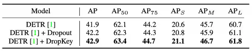 图 10 DropKey 和 Dropout 在 COCO 上的性能比较