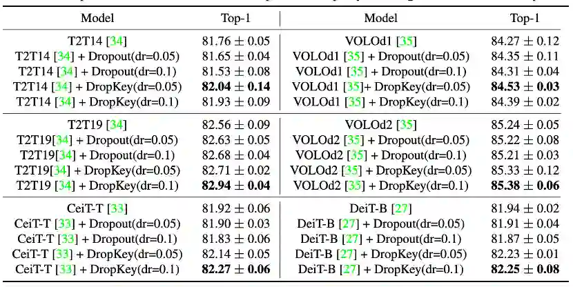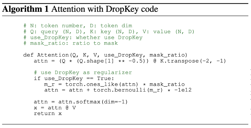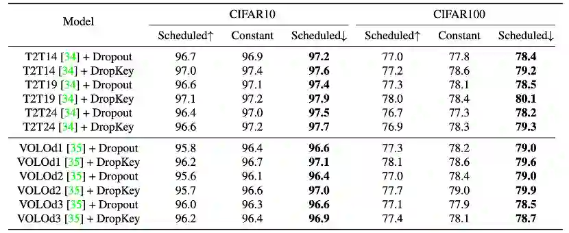 为了克服以上问题,该论文提出了一种即插即拔、仅需要两行代码便可实现的正则化器 DropKey 用以缓解 ViT 类方法的过拟合问题。不同于已有的 Dropout,DropKey 将 Key 设置为 drop 对象并从理论和实验上验证了该改变可以对高注意力值部分进行惩罚,同时鼓励模型更多关注与目标有关的其他图像块,有助于捕捉全局鲁棒特征。此外,该论文还提出为不断加深的注意力层设置递减的 drop 概率,这可以避免模型过度拟合低级特征并同时保证有充足的高级特征以进行稳定的训练。此外,该论文还通过实验证明,结构化 drop 方法对 ViT 来说不是必要的。