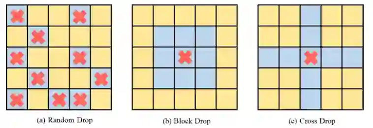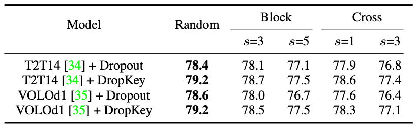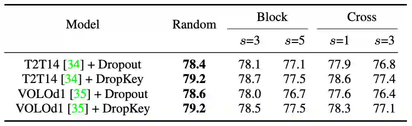 虽然在 CNN 中对结构化 drop 方法已有较为详细的研究,但还没有研究该 drop 方式对 ViT 的性能影响。为探究该策略会不会进一步提升性能,该论文实现了 DropKey 的两种结构化形式,即 DropKey-Block 和 DropKey-Cross。其中,DropKey- Block 通过对以种子点为中心的正方形窗口内连续区域进行 drop,DropKey-Cross 则通过对以种子点为中心的十字形连续区域进行 drop,如图 3 所示。然而,该研究发现结构化 drop 方法并不会带来性能提升。
