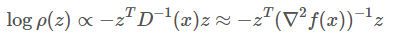 接下来我们介绍一些关于随机梯度下降动态的有趣猜想。让我们做一个类似中心极限定理的假设,并且假设我们可以将估计出的 g_B 分解成「真实」的数据集梯度和噪声项:g_B=g_N+(1√B)n(x),其中 n(x)∼N(0,D(x))。此外,为了简单起见,假设我们已经接近了极小值,因此 D(x)≈∇^2f(x)。n(x) 在指数参数中有一个二次形式的密度ρ(z):