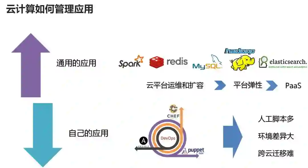 有没有方法解决这个问题呢?于是人们在IaaS平台之上又加了一层,用于管理资源以上的应用弹性的问题,这一层通常称为PaaS(Platform As A Service)。这一层往往比较难理解,其实大致分两部分,一部分我称为你自己的应用自动安装,一部分我称为通用的应用不用安装。