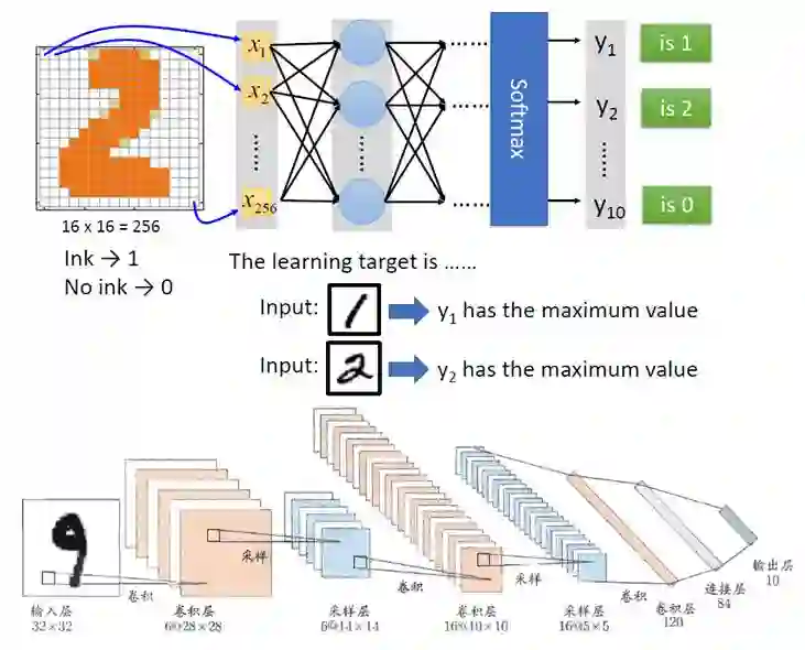 于是将n个神经元通过像一张神经网络一样连接在一起,n这个数字可以很大很大,所有的神经元可以分成很多列,每一列很多个排列起来,每个神经元的对于输入的权重可以都不相同,从而每个神经元的公式也不相同。当人们从这张网络中输入一个东西的时候,希望输出一个对人类来讲正确的结果。例如上面的例子,输入一个写着2的图片,输出的列表里面第二个数字最大,其实从机器来讲,它既不知道输入的这个图片写的是2,也不知道输出的这一系列数字的意义,没关系,人知道意义就可以了。正如对于神经元来说,他们既不知道视网膜看到的是美女,也不知道瞳孔放大是为了看的清楚,反正看到美女,瞳孔放大了,就可以了。