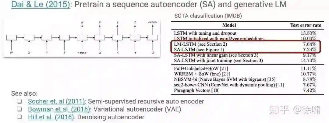 论文提出了两个方法,用无标签数据进行无监督训练的参数来初始化有监督学习的模型:一种是用基础的语言模型,另一种是用seq2seq自编码模型(sequence autoencoder, SA-LSTM),encoder 输入为WXYZ,decoder输出为依然为WXYZ。和普通的seq2seq模型相比不同的是,这里的encoder和decoder隐层是共享的。有种提前让循环神经网络学会句子的表达,再之后根据标签去学习分类的能力的思想。