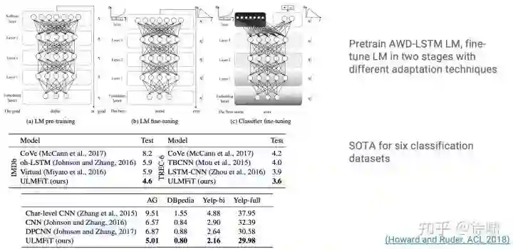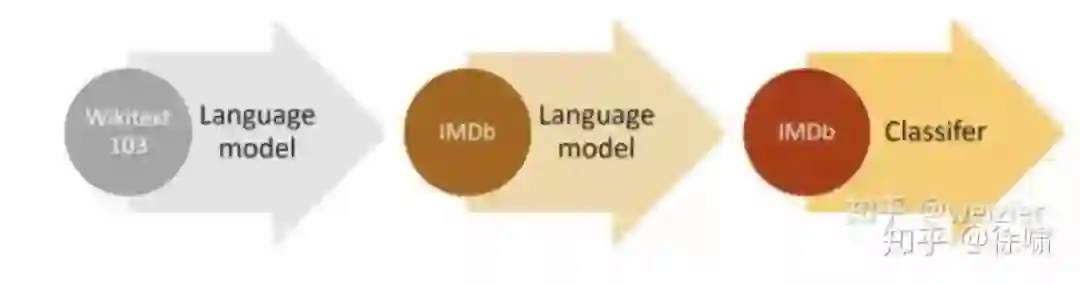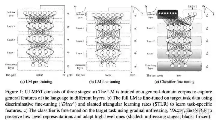 ULMFit的预训练和finetune过程主要可以分为三个阶段,分别是在大规模语料集上(比如Wikitext 103,有103million个词)先预训练,然后再将预训练好的模型在具体任务的数据上重新利用语言模型来finetune一下(这是第一次finetune,叫做LM finetune),尔后再根据具体任务设计的一个模型上,将预训练好的模型当做这个任务模型的多层,再一次finetune(这是第二次finetune,如果是分类问题的话可以叫做Classifier finetune)