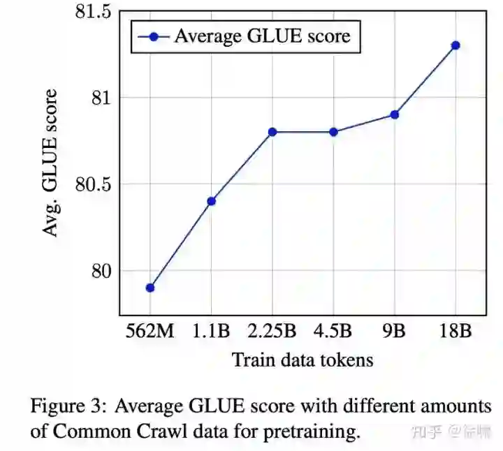 不同数据量的 Crawl 数据作为预训练的平均 GLUE 效果