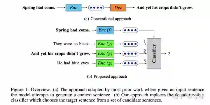 Quick-thoughts 在此基础上进一步改进,将生成任务改为分类任务。具体说来就是把同一个上下文窗口中的句子对标记为正例,把不是出现在同一个上下文窗口中的句子对标记为负例,并将这些句子对输入模型,让模型判断这些句子对是否是同一个上下文窗口中,很明显,这是一个分类任务。可以说,仅仅几个月之后的BERT正是利用的这种思路。而这些方法都和Skip-thoughts一脉相承。