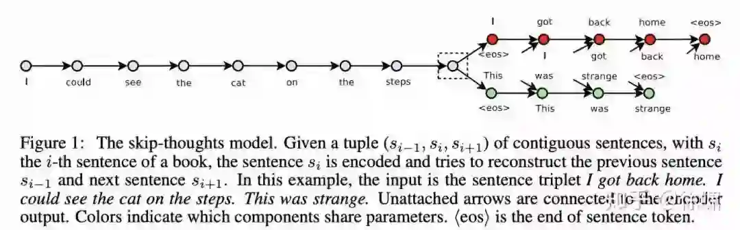 借鉴 Skip-gram 的思想,Skip-thoughts 直接在句子间进行预测,也就是将 Skip-gram 中以词为基本单位,替换成了以句子为基本单位,具体做法就是选定一个窗口,遍历其中的句子,然后分别利用当前句子去预测和输出它的上一句和下一句。