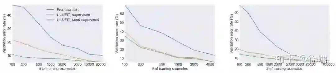 预训练的一个主要好处就是它减少了对有标注数据的需求。在实际使用中,与非预训练模型相比,迁移学习模型通常只需要十分之一甚至更少的样本数量就达到类似的表现,如下图(ULMFIT Howard and Ruder, 2018)所示。